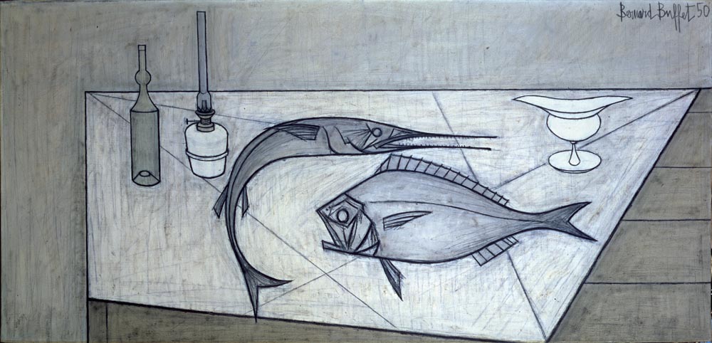 Bernard Buffet (1928-1999) Nature morte aux poissons,1950 huile sur toile.97x 195cm Collection Fonds de dotation Bernard Buffet, Paris